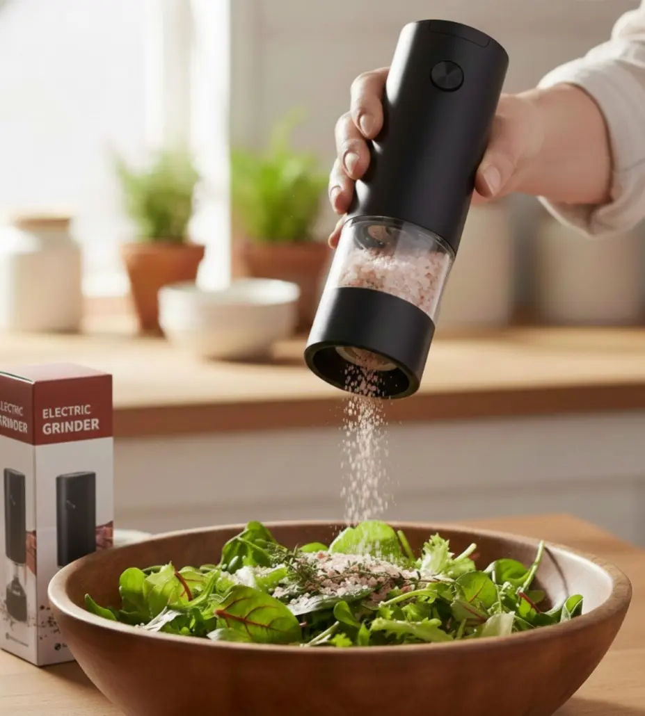 Práctico y moderno molinillo eléctrico ideal para condimentar tus comidas con un solo toque.